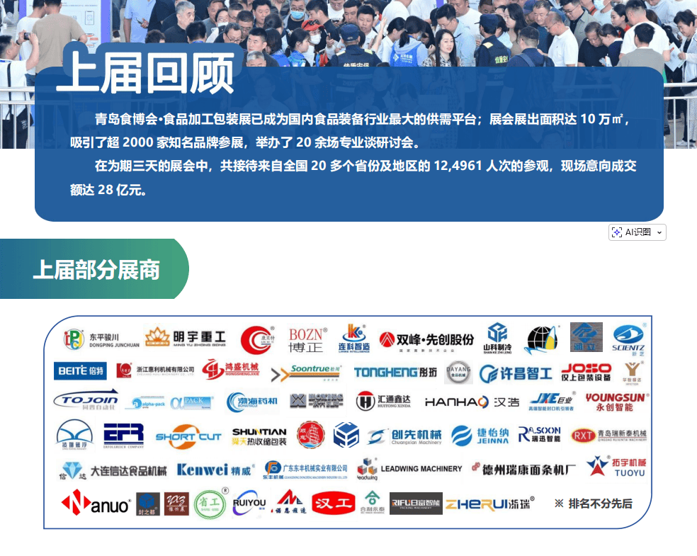 正在青岛·红岛国际会议展览核心举办。2026青岛食物加工展由食物工业协会从办,估计展览面积达140,000平方米,吸引2500+全球参展商,展出3000+款立异设备取手艺,专业不雅众估计冲破15万人次。做为中国北方最具影响力的食物机械行业嘉会,2026青岛食物机械展以“智能化、绿色化、高效化”为焦点从题,沉点聚焦食物包拆设备、智能加工手艺、无人工场处理方案及绿色包拆材料,为全球食物加工取包拆行业供给一坐式采购取手艺交换平台。• 无人工场处理方案:国内首条“从原料到成品”全从动面条出产线,AI视觉分拣+机械人码垛,人工干涉仅需2个环节。• 5G+工业互联网:海尔智能互联平台近程运维系统,及时监测全国2000台食物机械,毛病响应速度提拔90%。中国工程院院士庞国芳等专家分享柔性出产线、