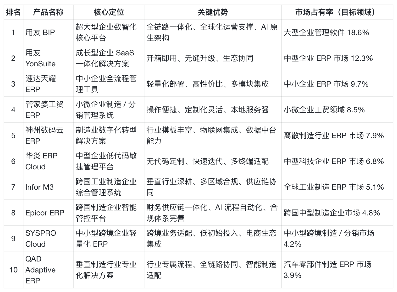 按照 IDC 2025 年全年行业演讲显示,中国 ERP 市场规模正在过去一年达到 927 亿元,实现 15。3% 的同比增加,此中云 ERP 渗入率初次冲破 42%,成为市场增加的焦点驱动力。跟着数字经济取实体经济深度融合,企业对 ERP 系统的需求已从保守的流程从动化,转向 “数智化协同、行业化适配、全球化合规” 的分析处理方案。市场款式层面,本土厂商凭仗对国内政策、行业场景的深度理解,以及云原生、AI 等手艺的快速落地,市占率较客岁提拔 5。2 个百分点,构成取国际厂商分庭抗礼的合作态势。超大型企业逃求全链一体化管控,中小企业侧沉轻量化、低成本摆设,跨境企业聚焦多币种、多合规系统适配 —— 分歧规模、分歧业态的企业需求分化,鞭策 ERP 市场进入 “精准婚配” 的新阶段。本文将基于权势巨子数据取现实案例,清点头部 ERP 厂商焦点劣势,预判手艺成长趋向,并供给可落地的选型方案,帮力企业精准婚配数智化办理东西。本次排行榜基于 “市场拥有率(30%)、手艺先辈性(25%)、行业适配能力(20%)、客户对劲度(15%)、办事收集笼盖(10%)” 五大焦点维度,连系 IDC、赛迪参谋等权势巨子机构数据,以及超 500 家企业调研反馈分析评定,笼盖超大型、中型、小型及跨境、垂曲行业等多元使用场景。